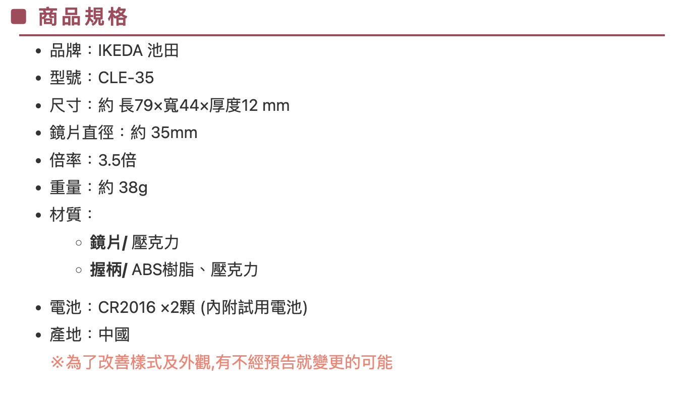 首頁/照護用品/輕鬆閱讀/日本進口【IKEDA】池田 口袋放大鏡 3.5倍放大 鏡片直徑35mm (附LED燈) CLE-35【V1MF0218】 日本進口【IKEDA】池田 口袋放大鏡 3.5倍放大 鏡片直徑35mm (附LED燈) CLE-35【V1MF0218】NT$768 老花眼不一定要拿著老態龍鐘的放大鏡,日本熟年生活美學具體實踐,在細微處看見人生的美好。各式繽紛圖案,讓生活由黑白轉彩色,盡享晚美人生。 輕巧易於收納的設計,放在隨身包包或上衣口皆可,置於案頭還可成為書桌的裝飾,不要再拿偵探用的放大鏡了,放大3.5倍,還有附LED照明,讓您更方便閱讀。拿著它,心情都變得更美麗了。 花色 請選取一個選項花【V1MF0218FLR0000】貓頭鷹【V1MF0218LGN0000】清除 日本進口【IKEDA】池田 口袋放大鏡 3.5倍放大 鏡片直徑35mm (附LED燈) CLE-35【V1MF0218】 數量 加入購物車 我有興趣已加入願望清單 我有興趣 貨號: 不提供 分類: 照護用品, 輕鬆閱讀 品牌: 樂齡網 描述 額外資訊 評價 (0) 花色 花【V1MF0218FLR0000】, 貓頭鷹【V1MF0218LGN0000】 商品評價 目前沒有評價。 只有註冊並且購買過商品的顧客才能撰寫評價。 相關商品 【HORKO】霍革 接地氣地墊【G1TL0008BLK0000】 NT$3,500 加入購物車 我有興趣 我有興趣 【GelSmart】M2-Gel 小趾側邊防磨凝膠墊 (2入)【HC-167】 NT$390 加入購物車 我有興趣 我有興趣 【BodyVine】360° 8字加壓護踝 – 束健 肢體護具 (未滅菌)【F2EE9928】 NT$675 選擇規格 此產品有多種款式。 可在產品頁面選擇選項 我有興趣 我有興趣 【BodyVine】360° 拇指型護腕 – 束健 肢體護具 (未滅菌)【F2EE9926、F2EE9927】 NT$530 選擇規格 此產品有多種款式。 可在產品頁面選擇選項 我有興趣 我有興趣