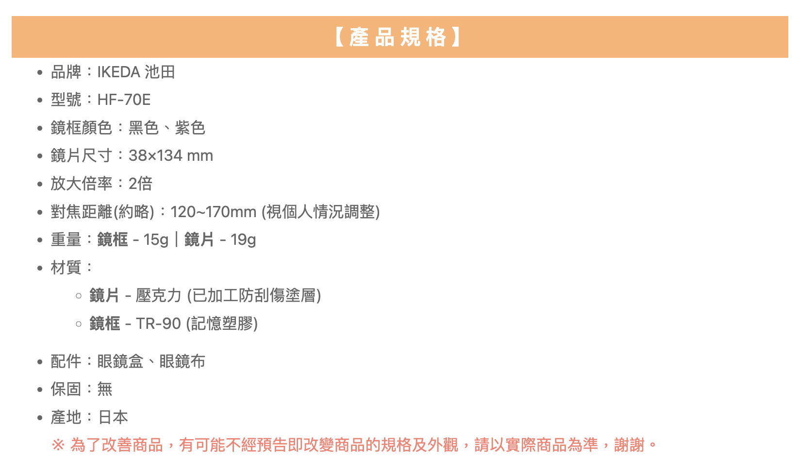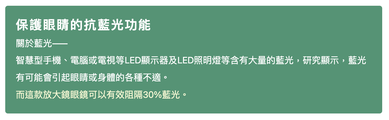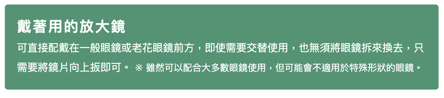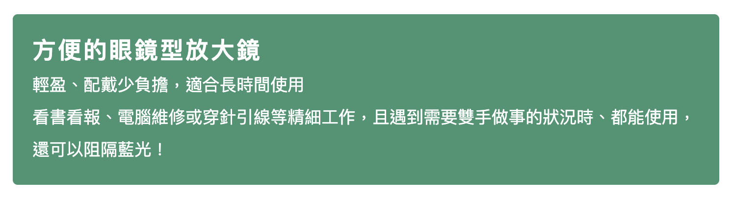 首頁/照護用品/日本進口【IKEDA】池田 眼鏡式放大鏡 2倍 HF-70E【V1MF9517】 日本進口【IKEDA】池田 眼鏡式放大鏡 2倍 HF-70E【V1MF9517】NT$2,999 隨著年齡增長,視力越來越模糊不清,這時需要一個不占用雙手的放大鏡來閱讀或工作,此款商品將是您的最佳選擇。戴眼鏡或老花眼鏡也可再戴上此放大鏡,不用再一手拿著放大鏡,一手拿著書。用雙眼看,視野更開闊! 眼鏡式放大鏡是一款可以解放雙手、像配戴眼鏡般使用的放大鏡。非常適合用於長輩閱讀書報、打毛線、裁縫或製作手工藝品,如:手鍊串珠等用途。 即使戴著一般眼鏡也可以配戴。※雖然大多數眼鏡都可以配合使用,但特殊形狀的眼鏡可能無法使用。 顏色 請選取一個選項黑色紫色清除 日本進口【IKEDA】池田 眼鏡式放大鏡 2倍 HF-70E【V1MF9517】 數量 加入購物車 我有興趣已加入願望清單 我有興趣 貨號: 不提供 分類: 照護用品, 輕鬆閱讀 品牌: 樂齡網 描述 額外資訊 評價 (0) 顏色 黑色, 紫色 商品評價 目前沒有評價。 只有註冊並且購買過商品的顧客才能撰寫評價。 相關商品 悠護寶寶乳膏-原味 從 NT$430 選擇規格 此產品有多種款式。 可在產品頁面選擇選項 我有興趣 我有興趣 日本製【Aura】光彩護汝髮 銀離子感光 白髮補色護髮乳 75g Ⅲ【P1PC0085BLK0000】 NT$1,680 加入購物車 我有興趣 我有興趣 【BodyVine】360° 8字加壓護踝 – 束健 肢體護具 (未滅菌)【F2EE9928】 NT$675 選擇規格 此產品有多種款式。 可在產品頁面選擇選項 我有興趣 我有興趣 【HORKO】霍革 接地氣地墊【G1TL0008BLK0000】 NT$3,500 加入購物車 我有興趣 我有興趣