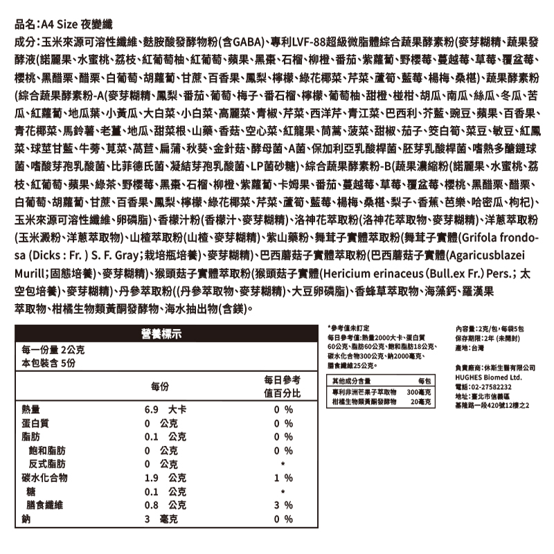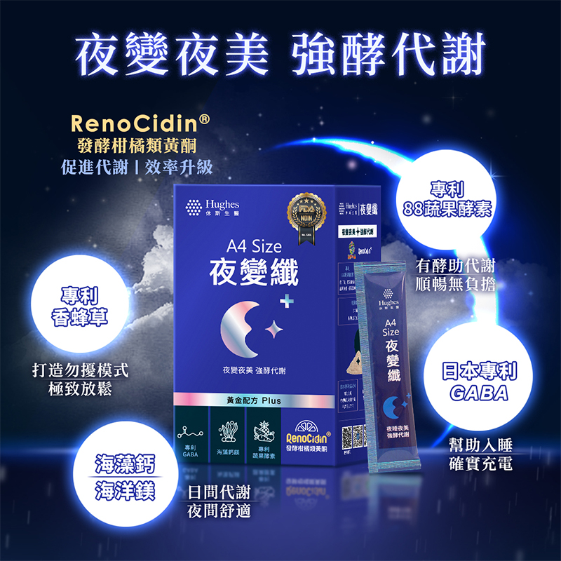 首頁/保健商品/美容保健/A4 SIZE 夜變纖 A4 SIZE 夜變纖NT$699 夜變夜美夜有酵!打造你的黃金休憩時段~ 日本最夯專利PharmaGABA + 專利香蜂草,啟動夜間模式。 LIPOMAX微脂體包覆88蔬果酵素,維持消化道機能、使排便順暢。 2:1完美比例調配專利海藻鈣、海洋鎂,幫助日間代謝、夜間舒適。 專利RenoCidin®配方,促進代謝、效率再升級。 通過多項安全認證,品質安全有保障。 ※每包2克,每盒14包 A4 SIZE 夜變纖 數量 加入購物車 我有興趣已加入願望清單 我有興趣 貨號: hughes-008 分類: 美容保健, 夜夜好眠, 女性保健, 男性保健 品牌: 休斯生醫 描述 評價 (0) 商品評價 目前沒有評價。 只有註冊並且購買過商品的顧客才能撰寫評價。 相關商品 元氣酵母B群膠囊(60粒/盒) NT$880 加入購物車 我有興趣 我有興趣 A4 SIZE 極光膠原 NT$799 加入購物車 我有興趣 我有興趣 A4 SIZE 時光膠原 NT$799 加入購物車 我有興趣 我有興趣 售罄多益菌粉包 NT$1,290 NT$1,030 查看內容 我有興趣 我有興趣