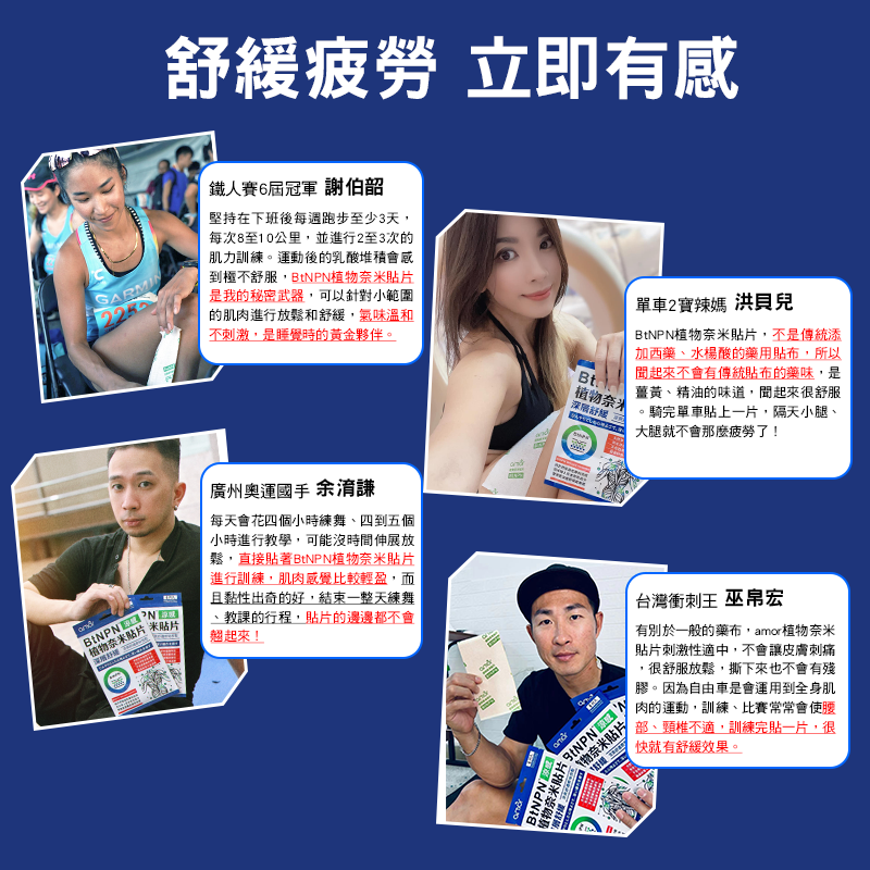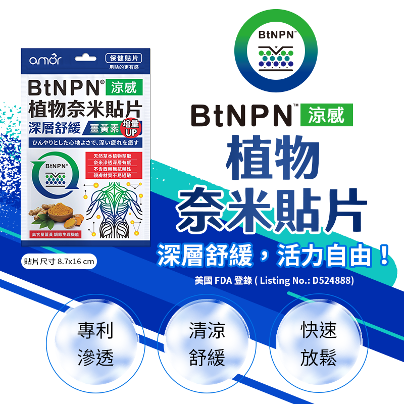 BtNPN植物奈米貼片能促進成分快速滲透。活性成分暢通無阻,高效吸收,達到深層舒緩放鬆!