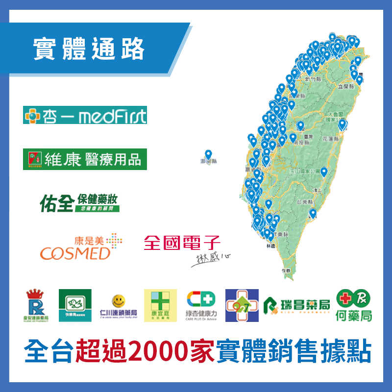 【實體通路據點】杏一醫療用品、維康醫療用品、佑全保健藥妝、全國電子